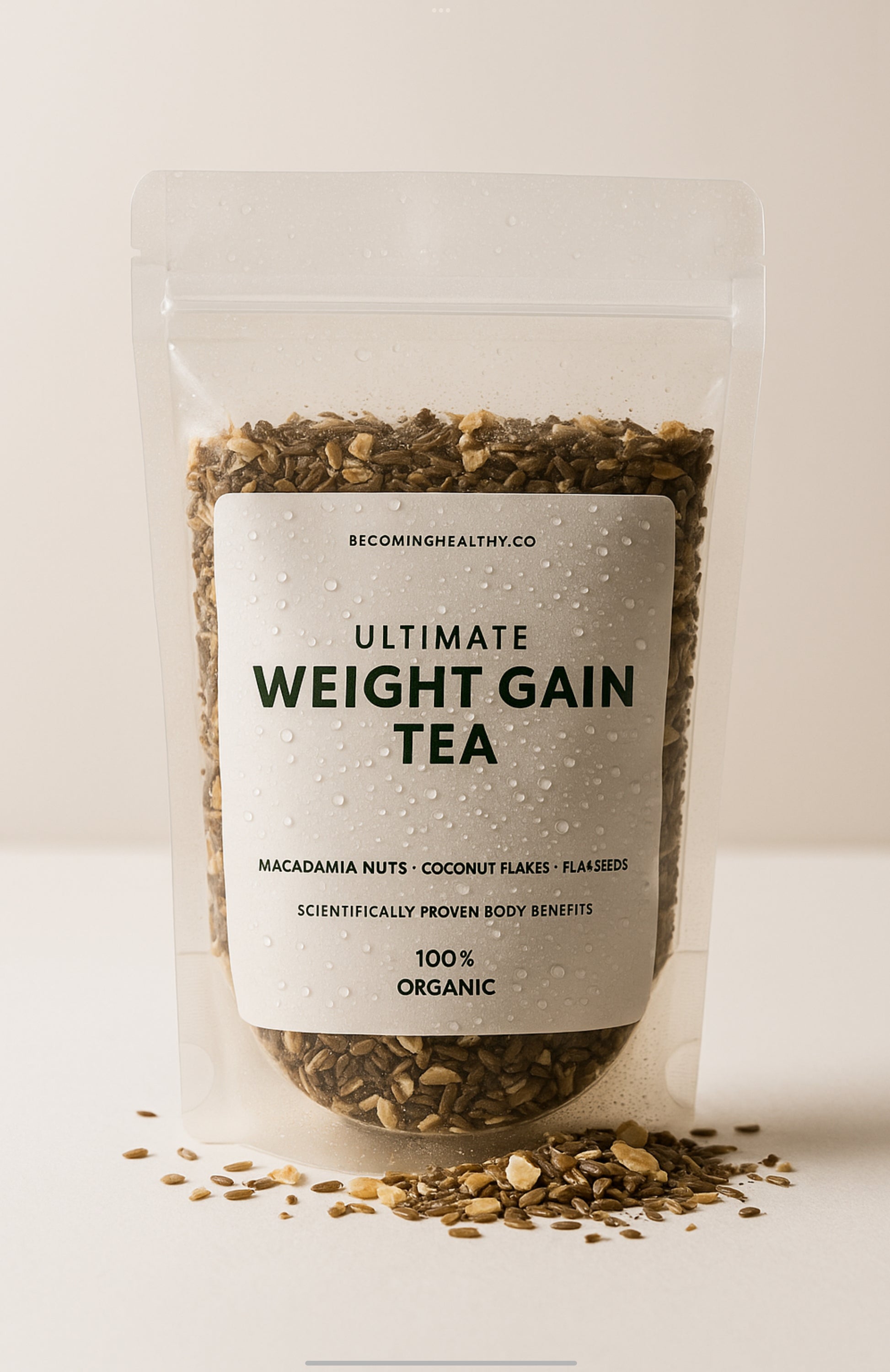 Introducing our exceptional Ultimate Weight Gain Tea, meticulously crafted from a blend of premium ingredients designed to promote healthy weight gain. This unique blend is carefully formulated with a combination of nourishing elements including Macadamia nuts, coconut flakes, and flaxseeds, perfectly curated to support your body's natural weight gain process.